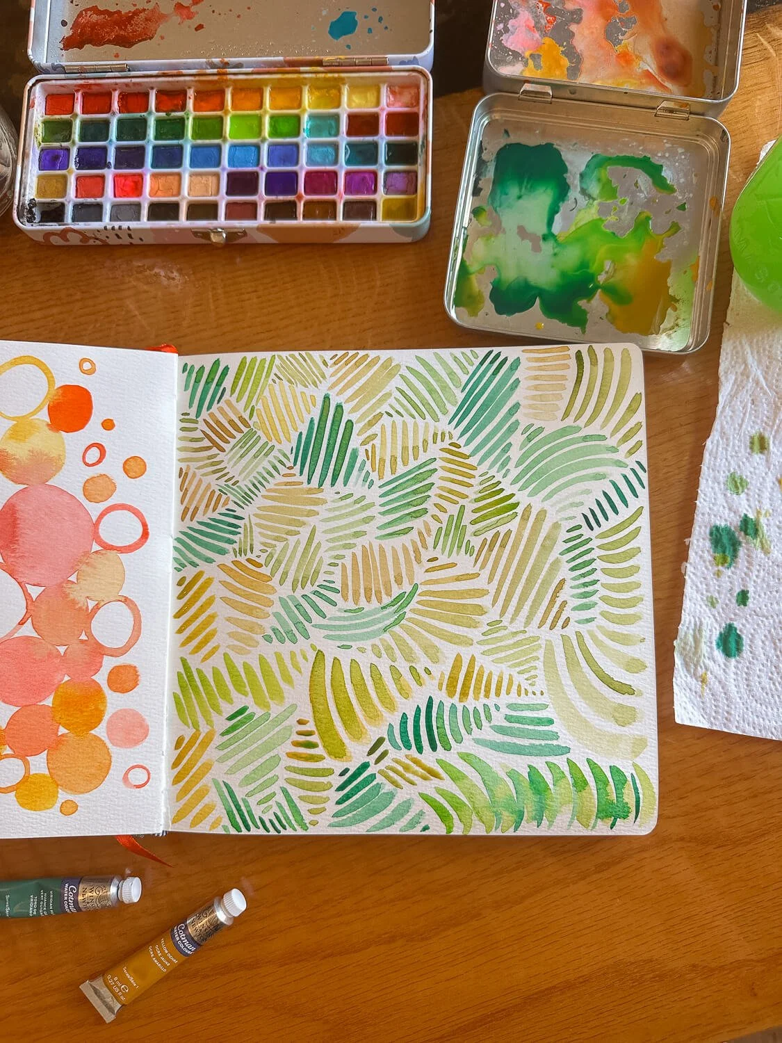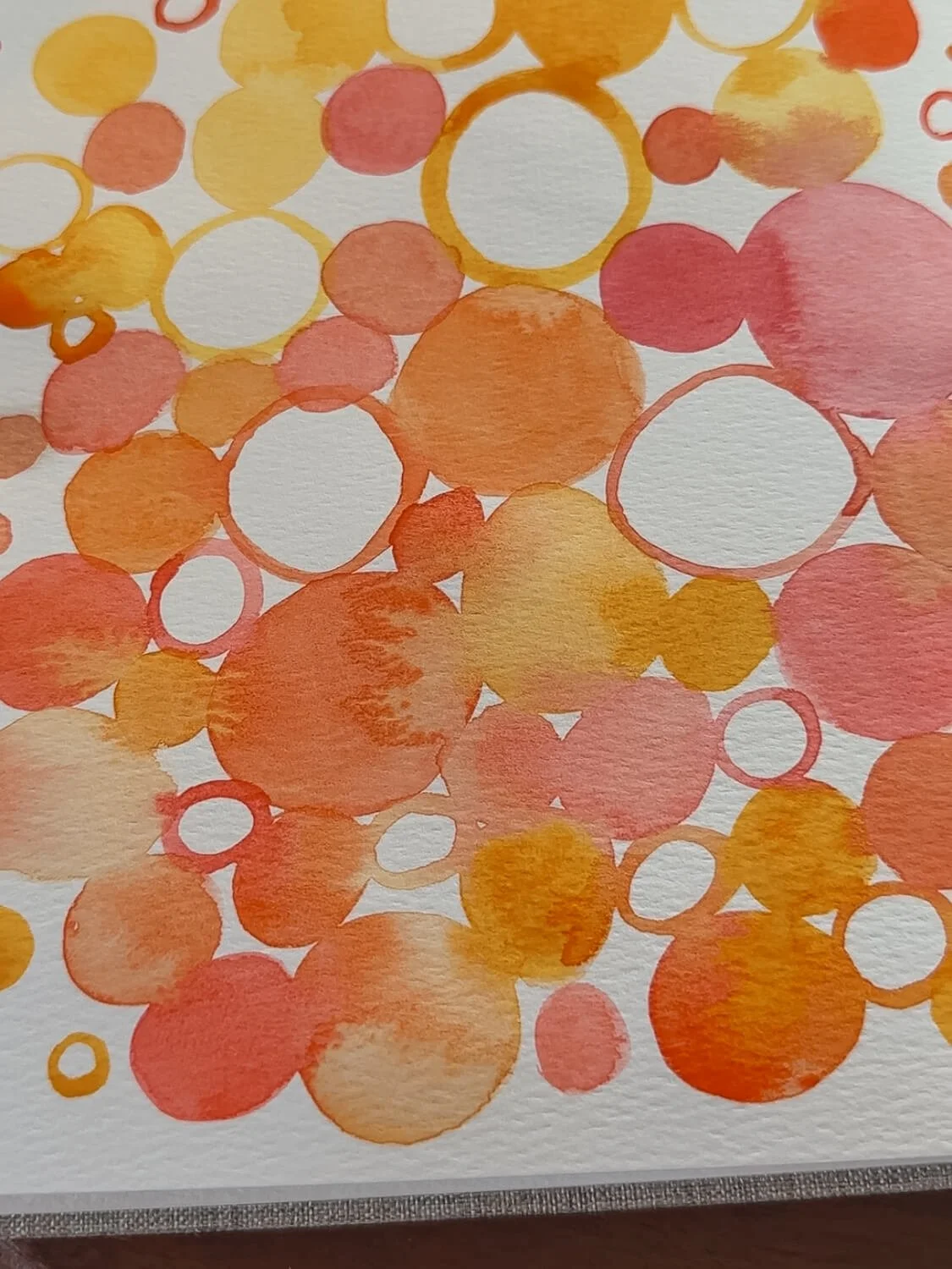 I filled a page in my sketchbook just painting circles over and over again. As they started to overlap and touch, the colors blended together in these really beautiful ways, creating watercolor blooms (sometimes called “cauliflowers”) where the pigments spread into each other. Watching that happen is honestly half the fun.