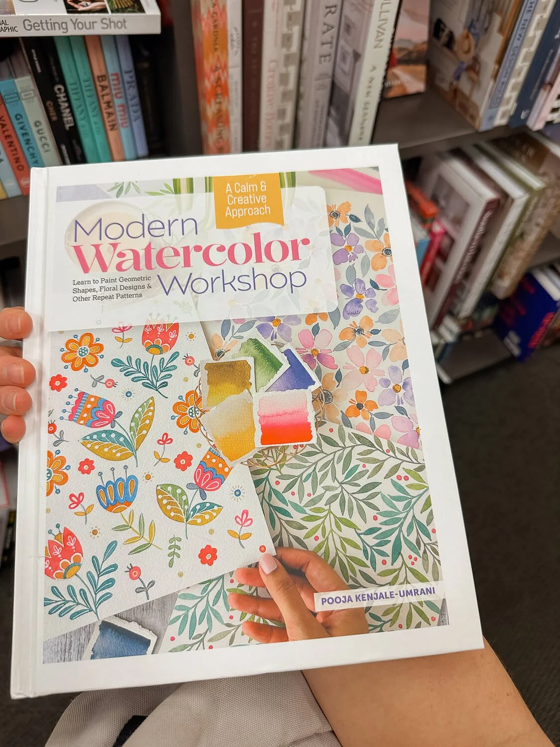 I had stopped in hoping to find some beginner watercolor inspiration, and one book immediately jumped out at me. It’s called Modern Watercolor Workshop: Learn to Paint Geometric Shapes, Floral Designs, and Other Repeat Patterns – A Calm & Creative Approach by Pooja Kenjale-Umrani. The cover alone was so beautiful that I picked it up, flipped through it for a few minutes, and decided to take it home. And I’m so glad I did!