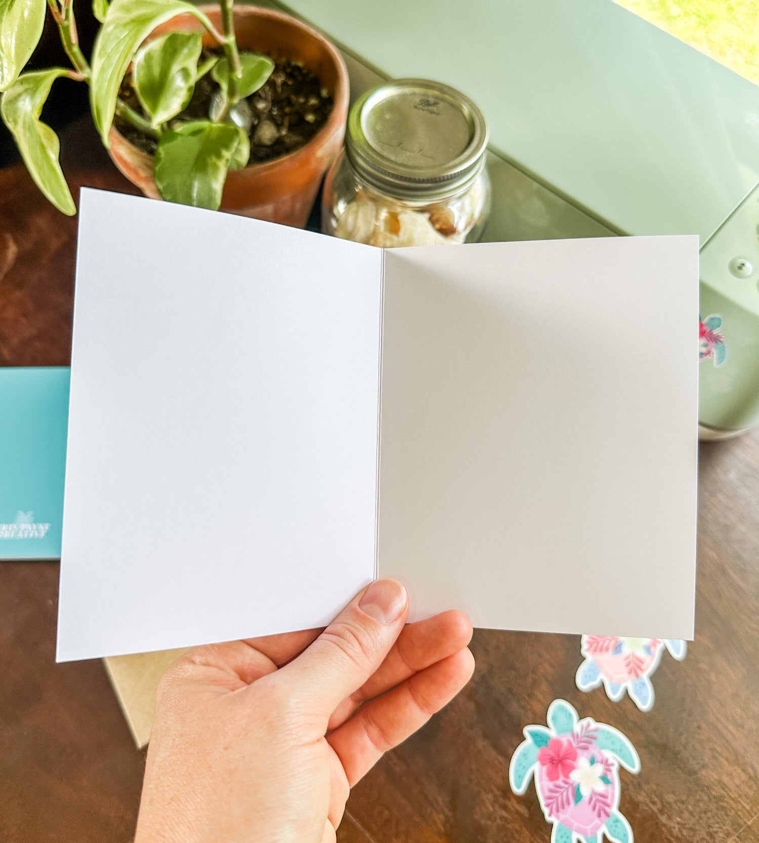 Let the saltwater soothe and the good vibes roll! This beachy card features a sea turtle surrounded by palm trees, waves, and retro florals—perfect for summer birthdays, beach thank-yous, or just-because notes from one ocean lover to another.